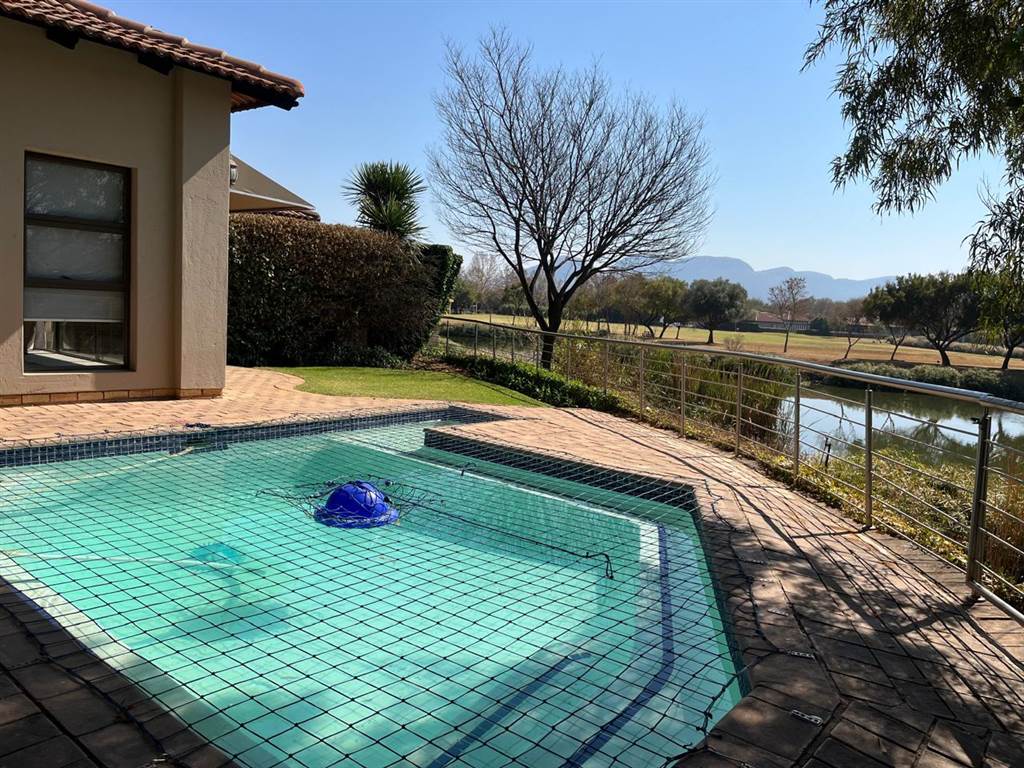Step into the inviting open-plan dining and lounge area, which opens up to a lovely patio, offering breathtaking views of the golf course dam.