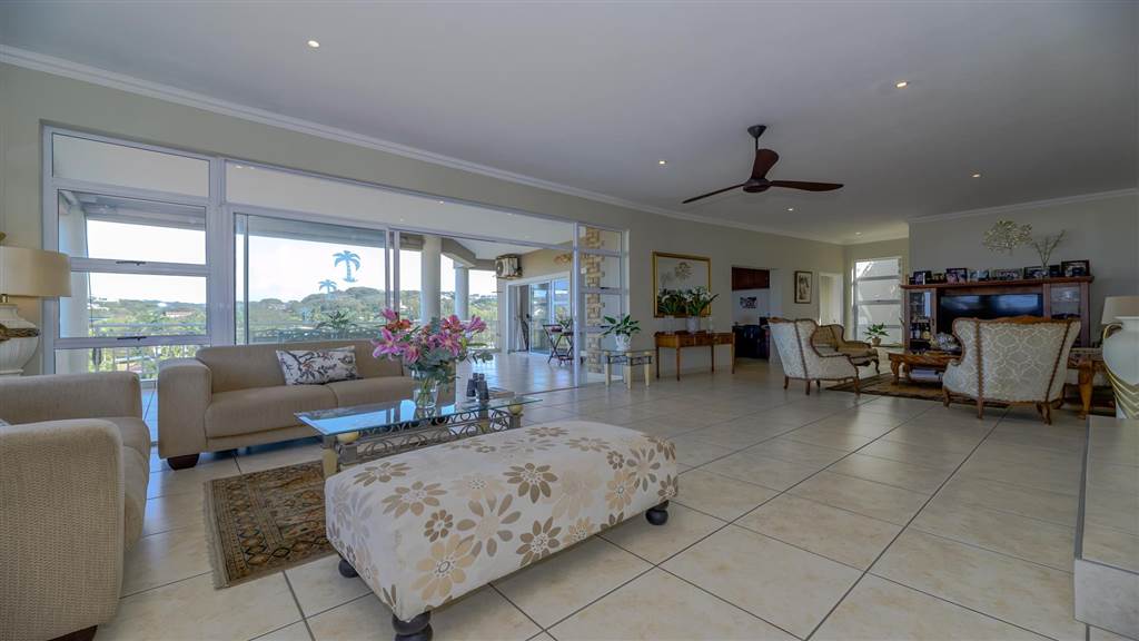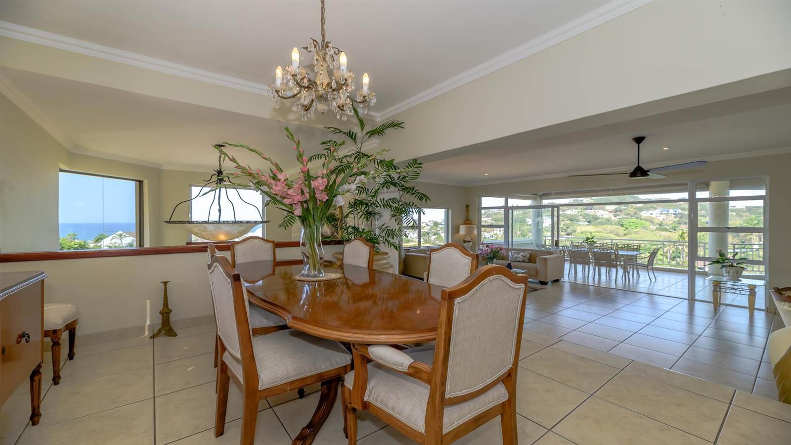 From the entrance hall, a staircase leads up to an expansive open-plan living area, designed for effortless flow. This bright, airy space includes a modern kitchen with a scullery, a dining area, and a lounge that opens onto a spacious balcony, revealing stunning sea and lush suburb views over Salt Rock.