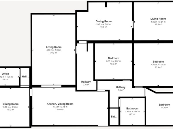 The kitchen combines functionality with charm, featuring wooden cabinetry, a central dining table, and open shelving. Multiple hallways connect the various spaces, enhancing the home''s flow. An office adds versatility to the floor plan.