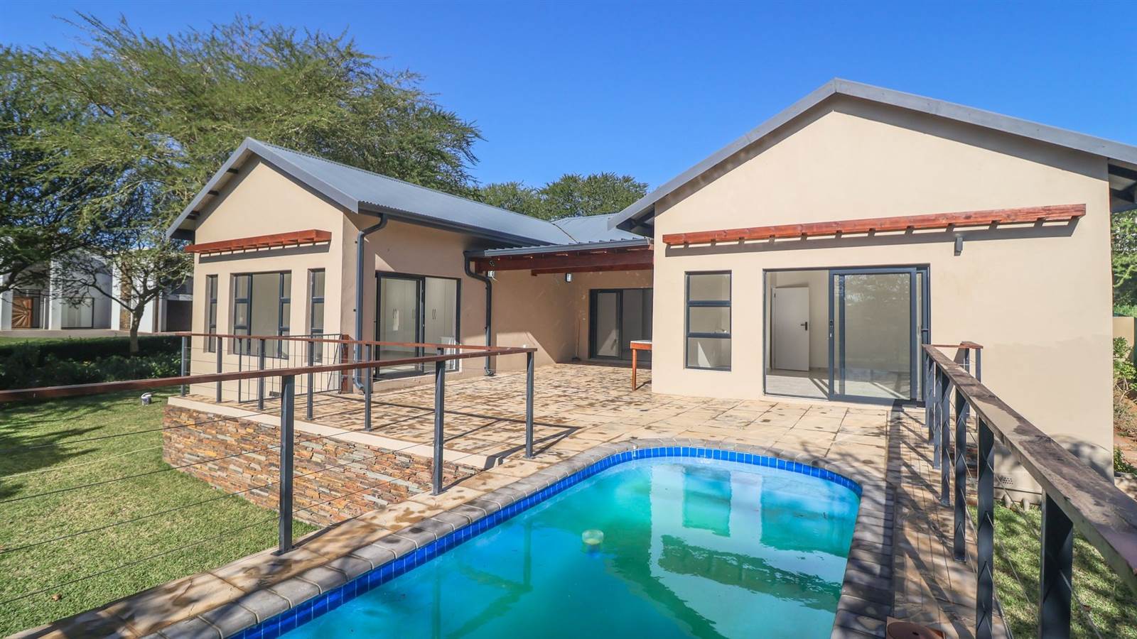 The heart of this home is its modern kitchen, which features a gas hob, ample cupboard space, and elegant granite countertops. This flows seamlessly into the open-plan living area, creating an inviting space for relaxation and entertaining. Step outside onto the covered patio, where you''ll find a sparkling pool, the perfect spot for outdoor enjoyment.