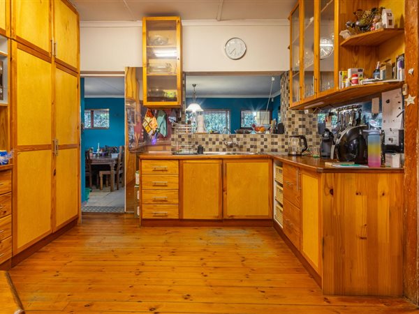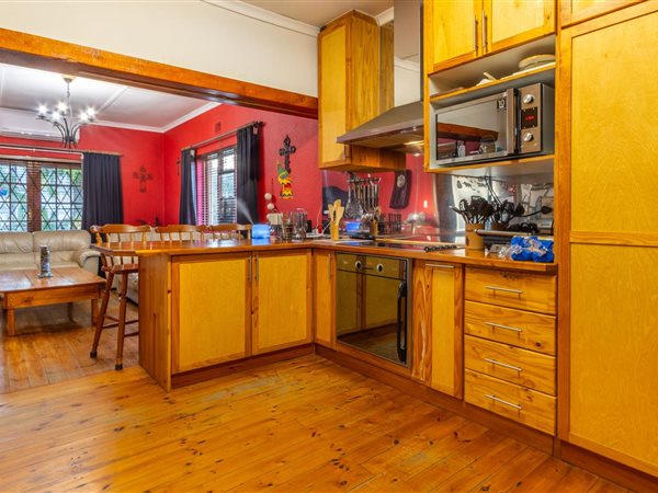 The open plan lounge with air conditioner flows comfortably towards a well equipped kitchen with a counter, electric hob, oven, extractor fan and plenty of beautiful wooden cupboards. The braai/tv room has a built-in braai and opens up to the under-cover patio with basin.