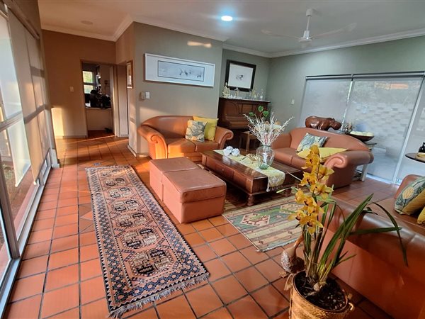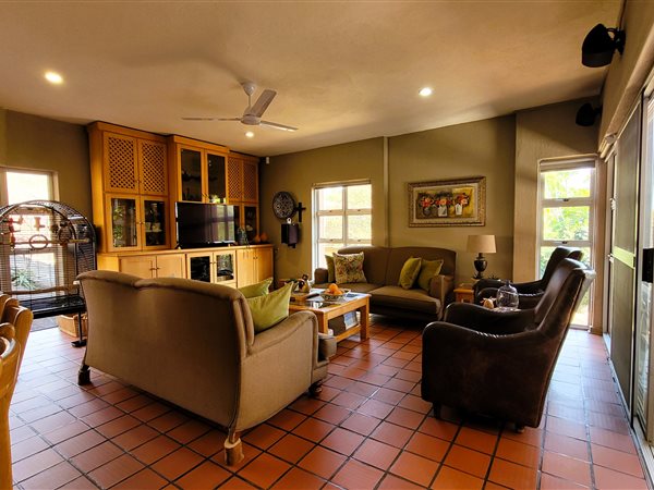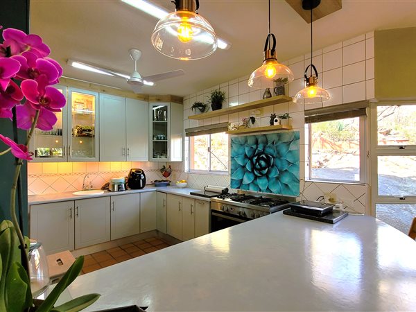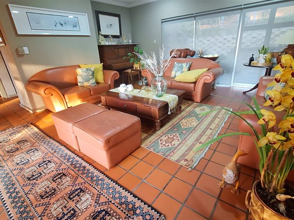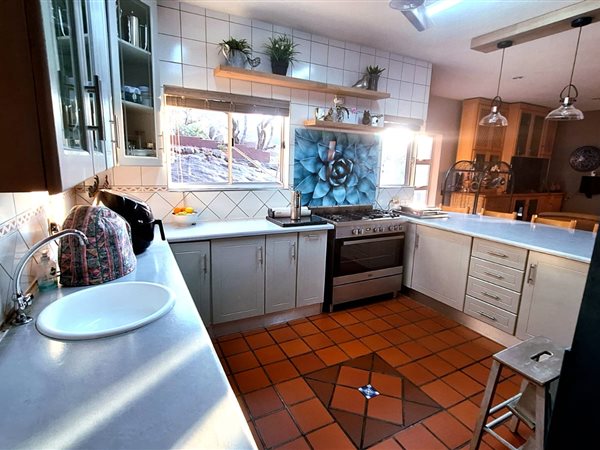 The home welcomes you with an impressive foyer, leading to spacious living areas that include two lounges and a dining room fitted with built-in oak cupboards. The neat kitchen is well-equipped with a gas stove, electric oven, pantry, and separate scullery.
