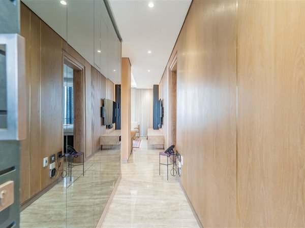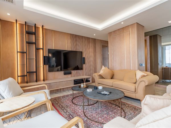 The apartment offers three well-appointed bedrooms, with the master featuring a luxurious en-suite bathroom, ensuring comfort and privacy. The contemporary design extends throughout, with warm wood paneling, elegant marble flooring, and integrated lighting enhancing the sophisticated aesthetic. A private balcony provides an ideal spot to enjoy the coastal breeze and stunning vistas.