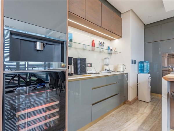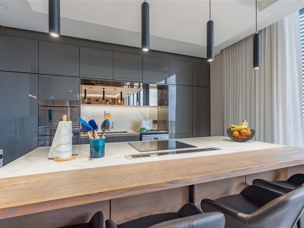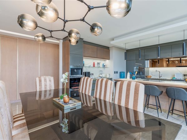 Discover sophisticated coastal living in this exquisite 3-bedroom, 2-bathroom apartment located within the prestigious Sibaya Precinct, Umhlanga. Spanning 189.00 sqm, this modern residence boasts an open-plan design, seamlessly integrating the lounge, dining area, and a sleek kitchen. The kitchen is a culinary delight, featuring glossy grey cabinetry, a spacious island with an integrated cooktop and bar seating, and high-end finishes, complemented by stylish pendant lighting. Expansive floor-to-ceiling windows flood the living spaces with natural light and offer breathtaking panoramic ocean views, creating an unparalleled ambiance.