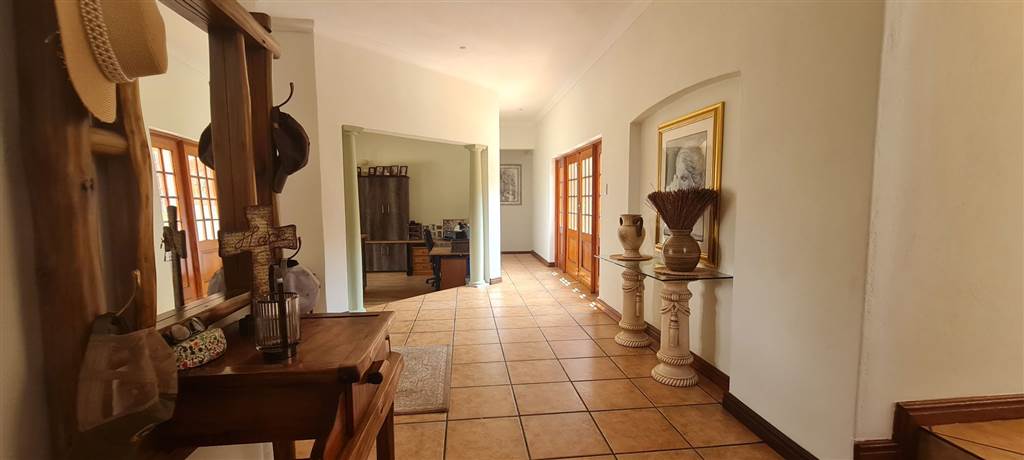 This house offers an entertainment-size living room with a custom-built TV cabinet and Bar, spacious, ultra modern kitchen with an open plan dining area, pantry and storeroom and a extra spacious study or office equipped with built in cupboards, quiet separate bedroom wings,a spacious master bedroom that is worthy of its name with a stunning view, Delightful swimming pool with lapa and braai area, huge double garage with extra storage, an additional wendy house and five Jojo tanks to ensure water problems never trouble you again, and to top it all off a beautiful garden maintained to perfection.