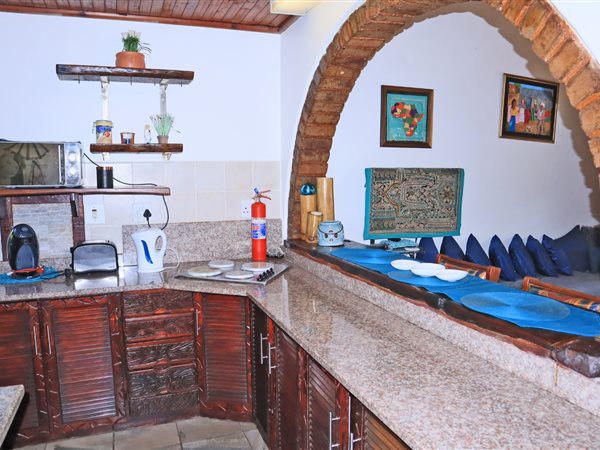 The interior exudes character with distinctive architectural elements. The lounge area, featuring an exposed wooden beam ceiling and built-in seating, flows seamlessly into the kitchen through a rustic brick archway. The kitchen is equipped with granite countertops, ample dark carved wooden cabinetry, and essential appliances, providing a functional yet charming space. Natural light floods the living areas, creating a bright and inviting ambiance.