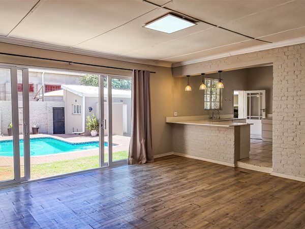The kitchen is bright and practical, with white granite tops, a pantry, and windows looking out onto the garden. Living spaces connect naturally from the lounge with doors opening to a tranquil side porch, to the dining area leading out through glass doors to a private backyard with swimming pool and separate entertainment room with built-in braai.