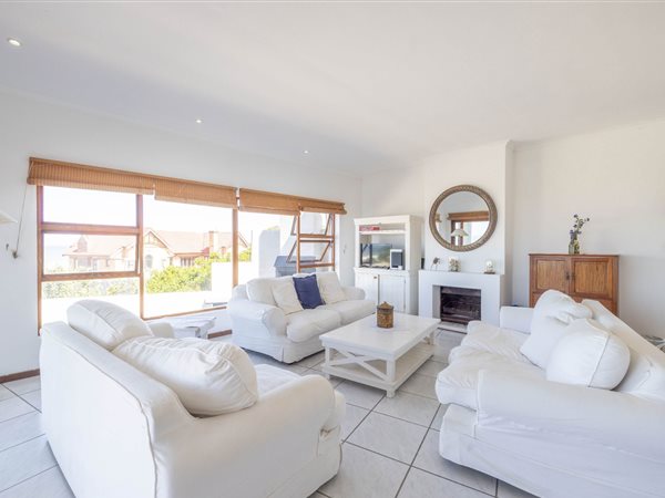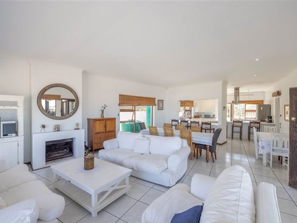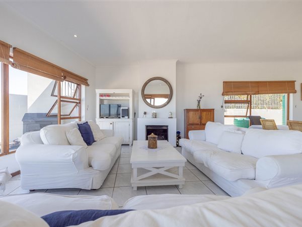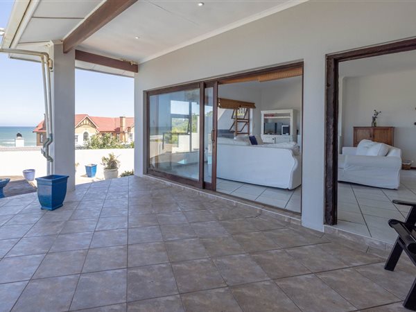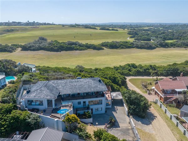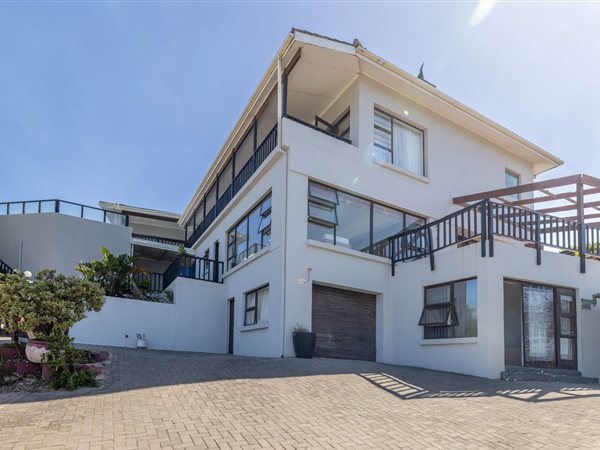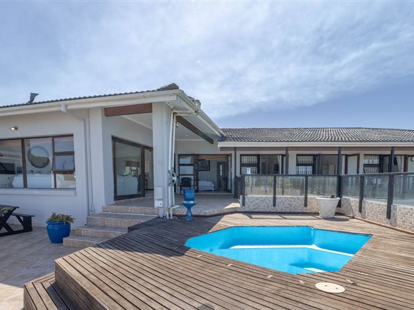 An outdoor entertainment area with a braai and splash pool, plus a wrap-around balcony linking five en-suite bedrooms, completes this coastal retreat.