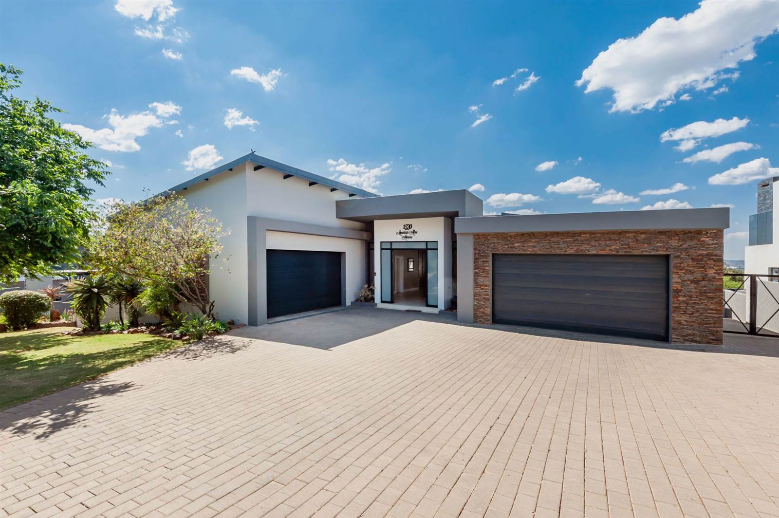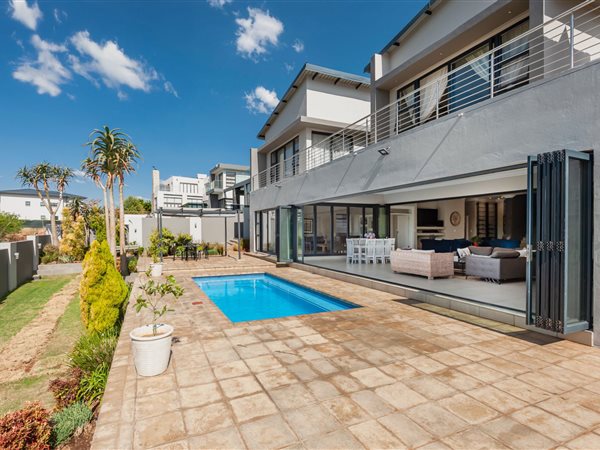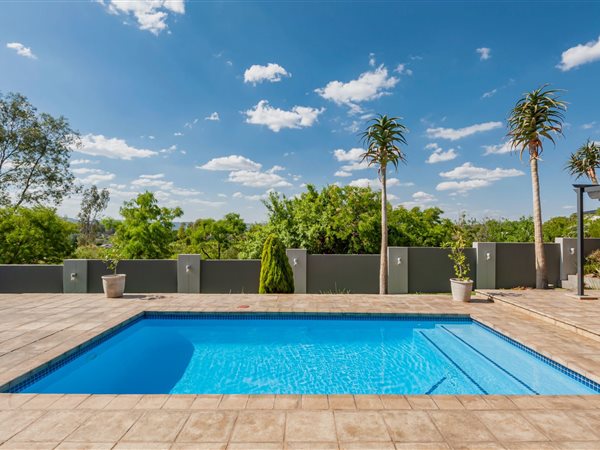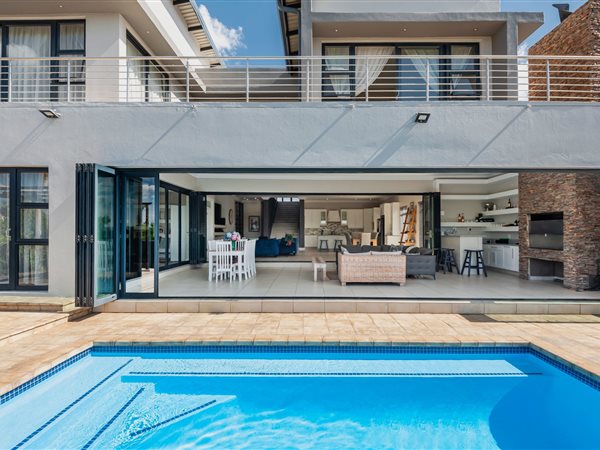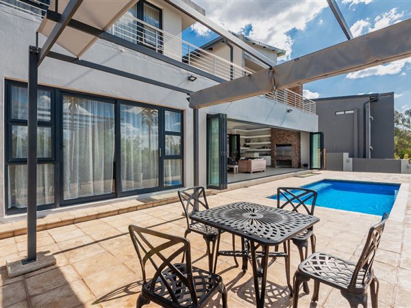 A grand double-volume entrance with a central staircase sets the tone for the spacious and light-filled interiors. Expansive formal living and dining rooms, each with their Chad-O-Chef gas fireplace, provide elegant spaces for entertaining. Flowing seamlessly from these areas are covered patios with stable-style doors that open directly onto the large, landscaped garden. At the heart of the outdoor space lies a large sparkling pool, perfect for relaxation, entertaining, or enjoying the sunshine with family and friends. The outdoor area also features a built-in braai and bar, creating the ultimate entertainers setting.
