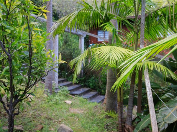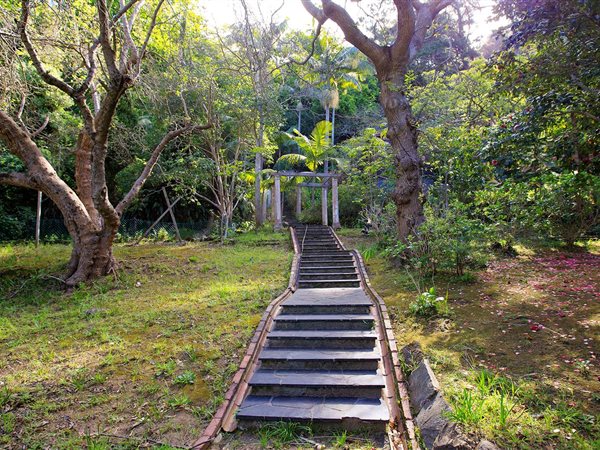 Embrace outdoor living with a visible blue swimming pool, perfectly situated within the dense greenery for ultimate privacy. A picturesque entrance features a weathered stone staircase ascending through the verdant setting, leading to the heart of this natural haven. The established gardens, complete with diverse foliage and flowering plants, provide a serene backdrop, while paved pathways offer inviting access through the grounds.